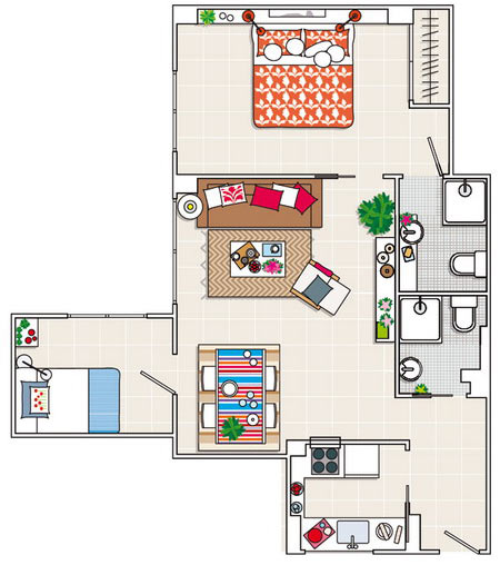 Không phải căn hộ chung cư nào cũng có hình thể đất nền vuông vắn, bức tường vát hay những khoảng “nhô” góc cạnh khiến cho việc phân chia các khu chức năng trong gia đình càng nan giải hơn. Tuy nhiên, với sự đa dạng, tiện lợi của nội thất hiện đại, bạn hoàn toàn có thể tìm ra giải pháp “tùy biến” cho không gian hẹp của mình. Có thể coi mô hình bài trí căn hộ 60m2 dưới đây là một ví dụ cho tổ ấm nho nhỏ, giản đơn nhưng vẫn ấm cúng và thể hiện được phong cách riêng của gia chủ.
